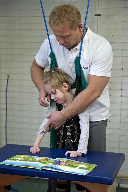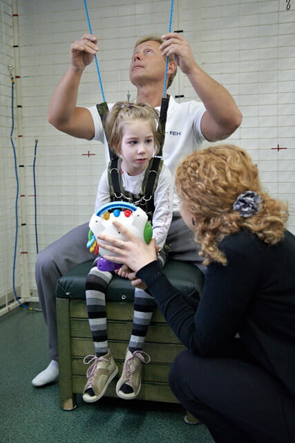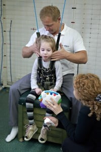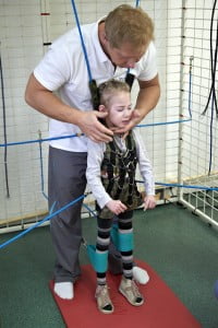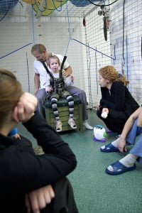 Na sali Julia spędzała dwie i pół godziny dziennie ciągiem, miała w zakładany kombinezon, była zapinana w pajączka, miała masaże, terapię ręki i ćwiczenia metodą NDT. Ciocia Ola dobrze już zna Julcię wie czego trzeba od niej wymagać i doskonale radzi sobie z jej próbami wymuszania czegoś płaczem. Julcia już na pewno też się nauczyła, że nic nie wskóra, choć próbowała mniej lub bardziej przez cały turnus 🙂