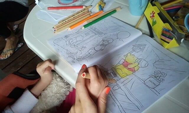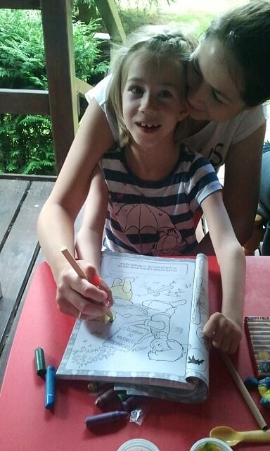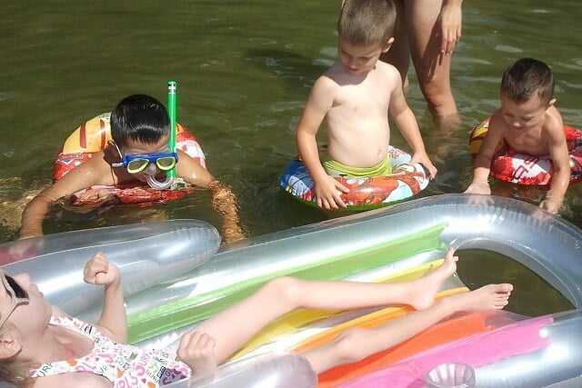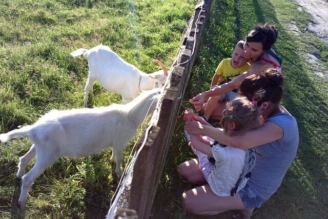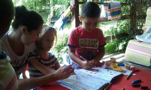 Jula wypoczęła w dosłownym tego słowa znaczeniu – oprócz zabaw tzw „zorganizowanych” (takich jak np robienie rakiet, lalek i kotków z tubek po ręcznikach papierowych, przy czym i my miałyśmy sporo zabawy 🙂 ), dzieciaki opalały się, oglądały bajki, kąpały w jeziorku i chodziły na spacerki gdzie niebywałą atrakcją było np karmienie lokalnych kózek (które nie wiadomo dlaczego trawkę podawaną im zza płotu znajdowały jako o wiele smaczniejszą niż tą którą miały pod nogami… :).
