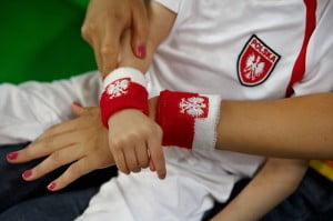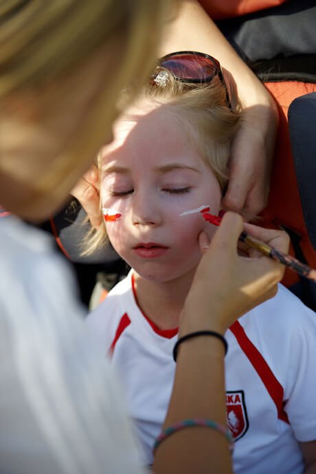 Dookoła stragany z przeróżnymi biało-czerwonymi gadżetami, skuszeni więc ofertą, jak na prawdziwych kibiców przystało namalowałyśmy sobie na policzkach z Julcią polskie flagi (tzn namalowała je Pani się tym zajmująca 🙂 )