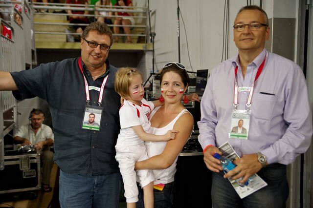 w międzyczasie pojawiła się na boisku reprezentacja Polski, witana ogromnym aplauzem. Do meczu było jeszcze pół godzinki i, żeby tak nie siedzieć i nie tracić czasu skorzystałyśmy z Julcią z możliwości sfotorgrafowania się z trenerem Ireneuszem Mazurem i panami Swędrowskim i Drzyzgą, komentatorami, których to głównie po głosie można rozpoznać bo komentują spotkania dla TV