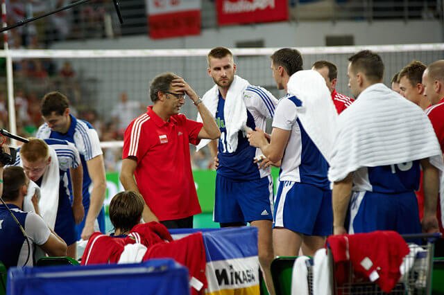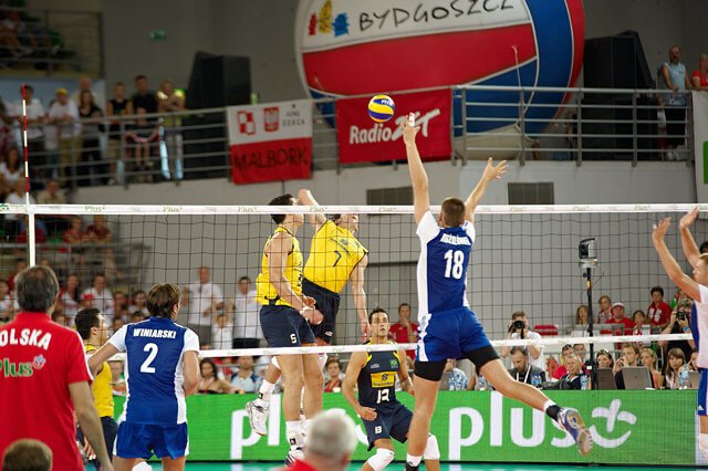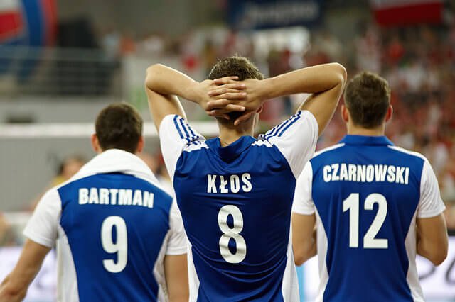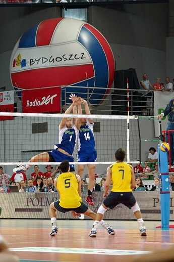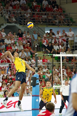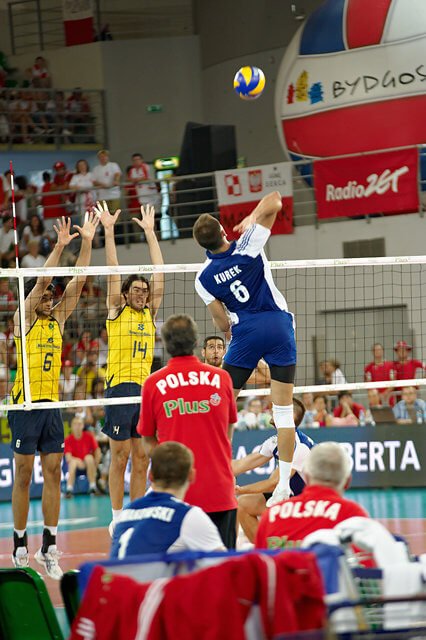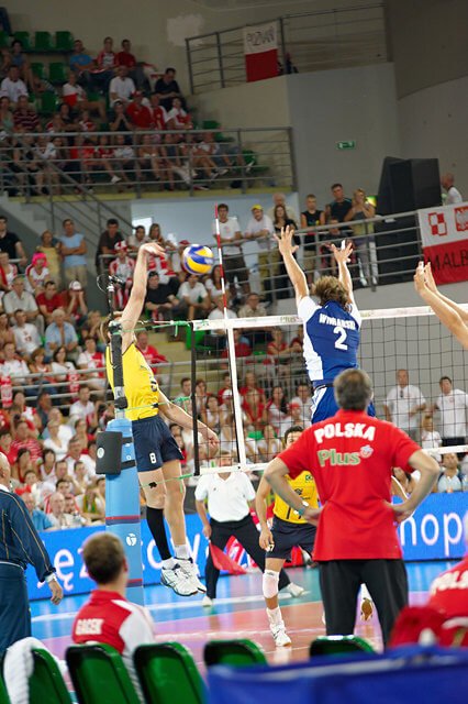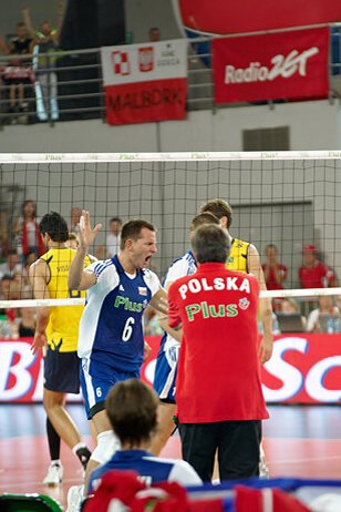 jak się przekonałam, oglądanie meczu na żywo powoduje, że zwraca się uwagę na rzeczy zupełnie w domu przed telewizorem niezauważalne. Np. na zawodników w kwadracie rezerwowych (siłą rzeczy musieliśmy na nich zwracać uwagę bo stali tuż przed nami i niestety zasłaniali momentami to co dzieje się na boisku…). Stoją sobie, śmieją się i obserwują mecz, wymieniają się uwagami (pewnie wszystko widzą 🙂 ) żywo komentując to co się dzieje w grze, szczególnie kwestie sporne, które po powtórkach na telebimie okazują się błędami sędziego… i muszę przyznać że nie zdawałam sobie sprawy jak ciekawy ów kwadrat może być 🙂 A chłopaki nie próżnują tam wcale, gotowi w każdej chwili wyjść na boisko rozciągają się, ćwiczą i masują, co szczególnie doceniła to Julcia, która z zaciekawieniem patrzyła na rozciągających się to w pionie to w poziomie to naszych chłopaków, to Brazylijczyków, w zależności od tego kto grał przy nas seta 🙂