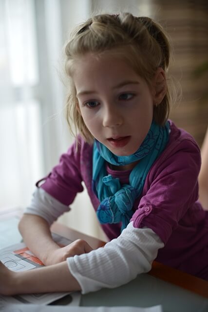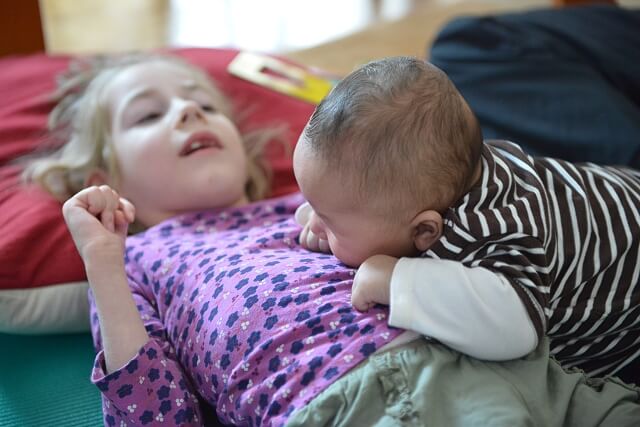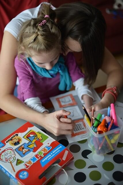 przy okazji Jula znowu pokazała że coraz lepiej utrzymuje się w pozycji siedzącej i coraz lepiej trzyma główkę w podporze, w końcu rehabilitacja ma pomagać w codziennych sprawach a odrabianie lekcji to przecież ważny punkt dnia pierwszoklasisty 🙂