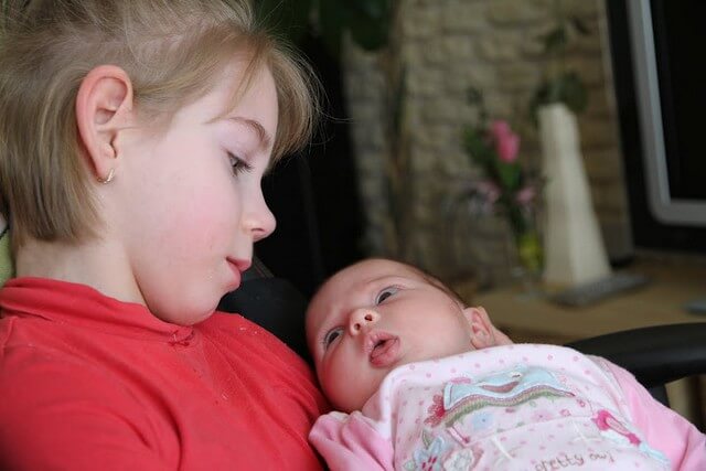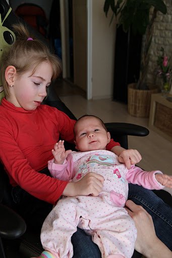 Julcia była zafascynowana dzidziusiem – jak przystało na starszą koleżankę spokojnie trzymała maluszka na kolankach i wpatrywała się cichutko 🙂