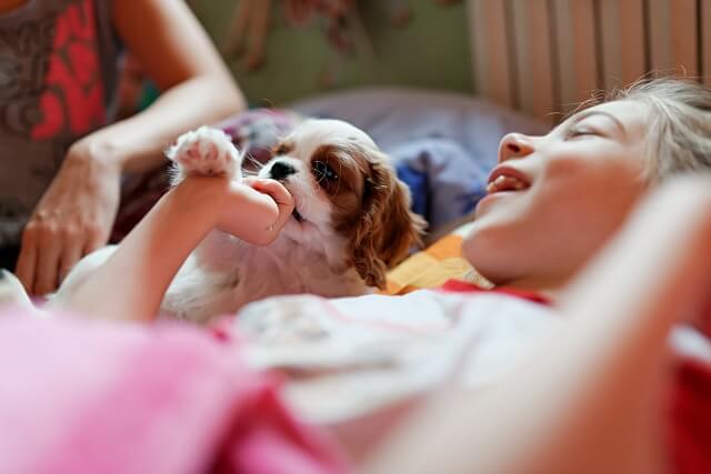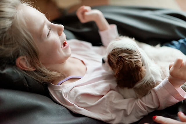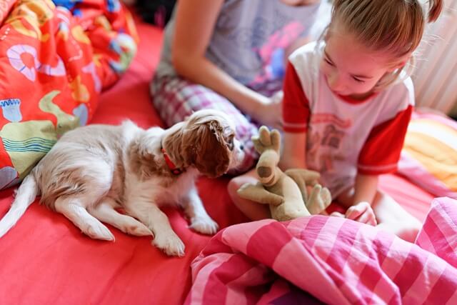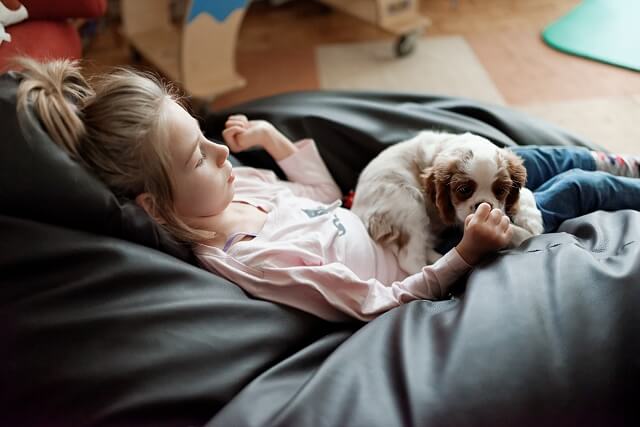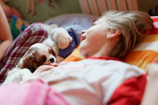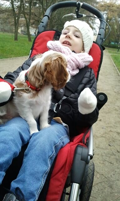 Dziś rano, po spokojnej ale przerywanej zabawami i próbami dostania się do Julci, nocy, Jula była od rana roześmiana od ucha do ucha jak Laki przywitał ją rano 🙂 Tata zabrał Lakiego na krótki spacerek.