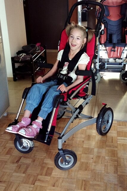 Kilka dłuższych wyjazdów podczas których sporo spacerowaliśmy i Julka spędziła dużo czasu w wózku pokazały że umie sobie w nim siedzieć nie tylko bez klina, nie tylko bez pasów odwodzących ale w ogóle bez pasów!… Zawsze przy zakupie wózka, oceniając jego parametry, specjalną uwagę zwraca się na spastyczne dzieci bo często mocno się napinają i wózek musi umieć to znieść z honorem…