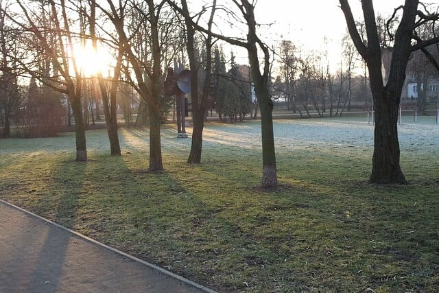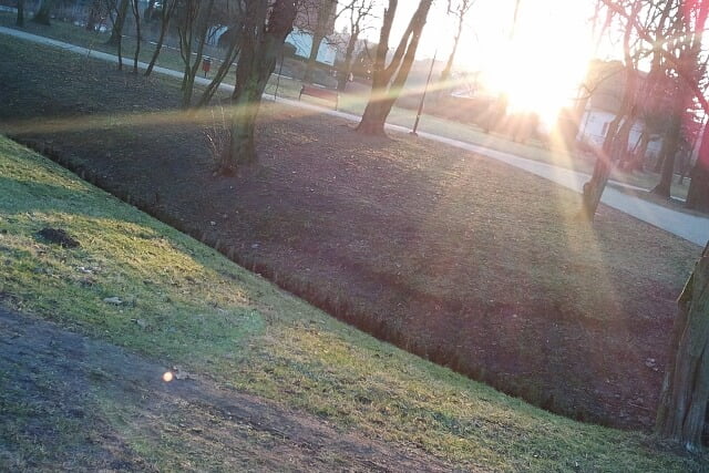 Zachwyciłam się pięknym obrazem parku chwilę po 7 rano, kiedy słońce jest jeszcze nisko i zaczyna się pojawiać za drzewami.