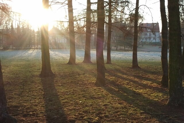 Cienie drzew razem z wschodzącym zza nich słońcem malują trawniki w jasno – ciemne pasy i naprawdę widok jest nieprzeciętny.